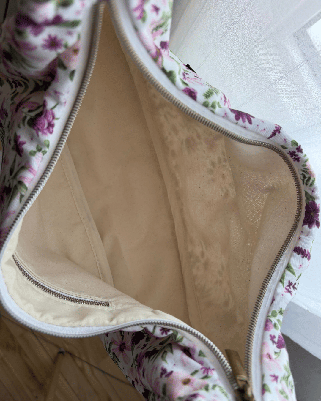 L’extérieur du sac est en canevas blanc à motif de fleurs avec le logo Dix-neuf en liège vert. L’intérieur est beige naturel avec une finition verte. L’ouverture du zipper principal est de 14 pouces tandis que celui de la poche intérieure mesure 6 pouces. Le sac se porte sur les deux épaules. La ganse est en nylon du même type que les ceintures de sécurité dans les voitures. Elle s'ajuste de 37 pouces à 55 pouces. Cette grandeur devrait convenir à la majorité des corps mais n'hésitez pas à me contacter pour ajouter ou rétrécir la ganse pour un sac à votre mesure! Mesures approximatives: 7 1/2” haut, 13” large, 4 1/2” profondeur Le sac est entièrement cousu par Noémie, ici au Québec!